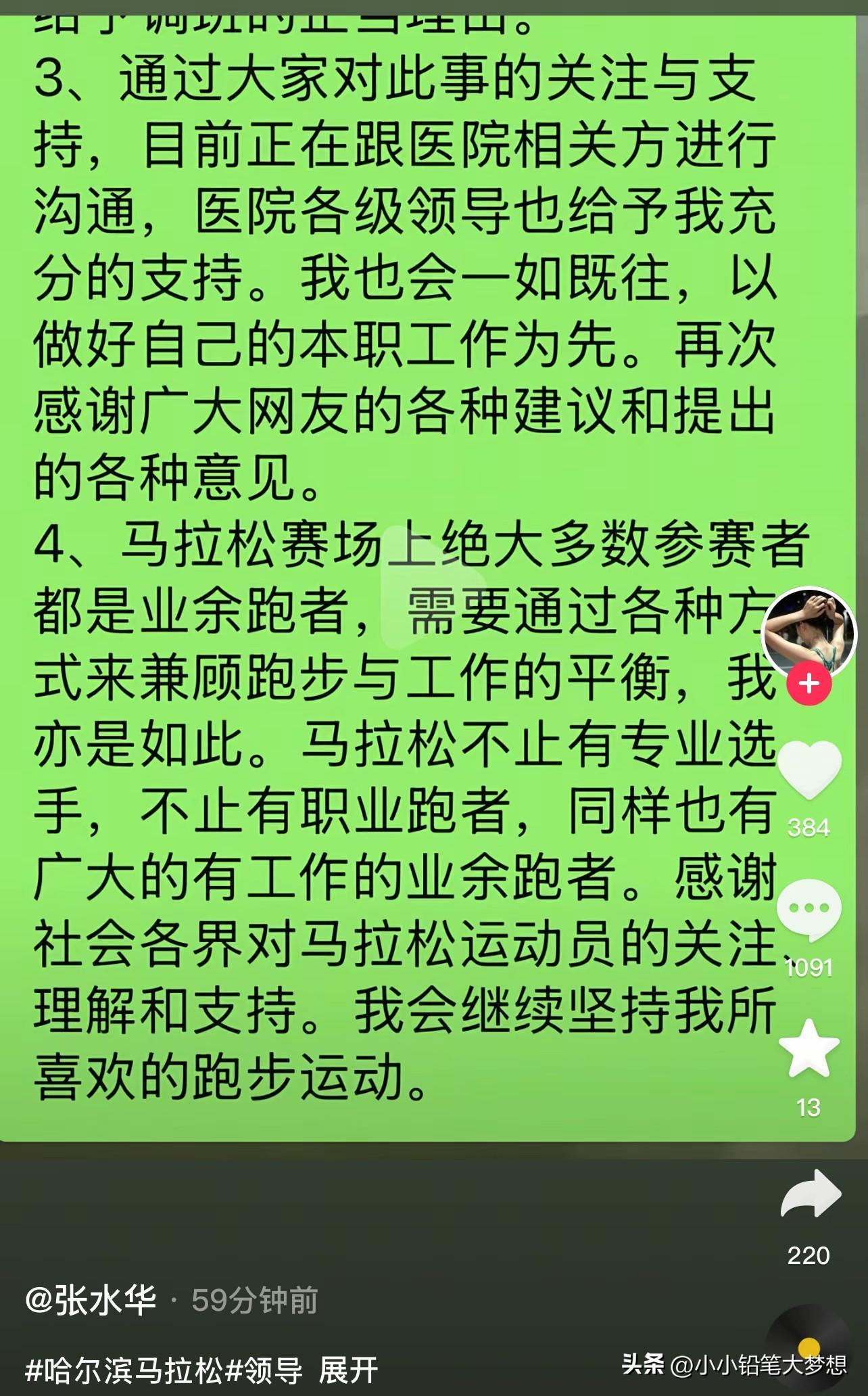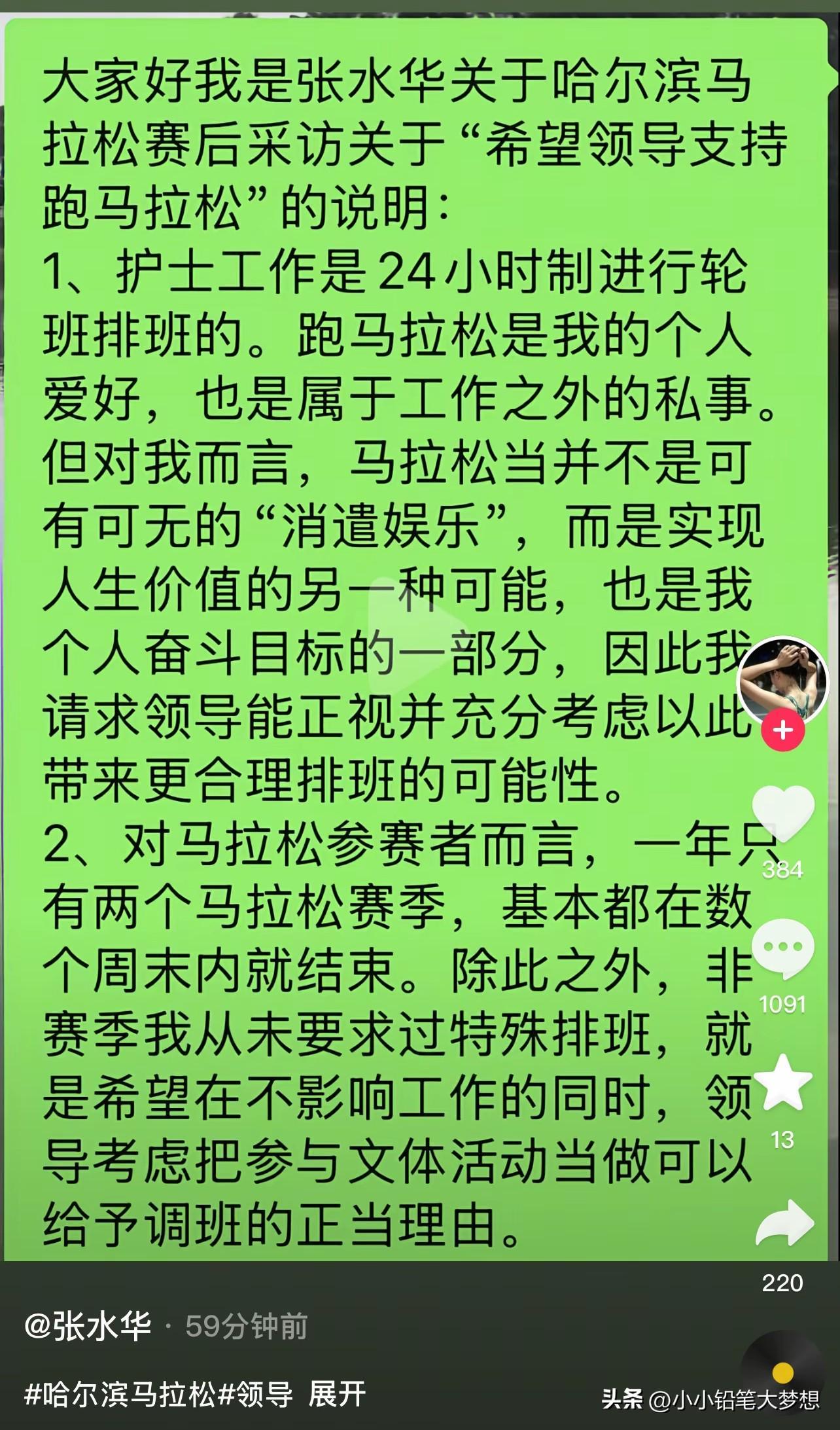 赛后她接受了采访,采访中她哭诉:“参加哈尔滨马拉松比赛特别不容易,”“领导说那是你个人爱好,同事愿意调你就去,不愿意调你就别去,我没办法排班给你。”“希望领导周末支持调休!”