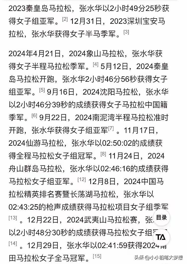 因为舆论发酵非常厉害,很多网友也扒出了她这些年跑马拉松的记录,发现张水华从2018年就开始参加全国大大小小的比赛,几乎不落下,且跑步成绩越来越好,不是她所说“一年只有两个马拉松比赛,基本就在数个周末就结束,”从网络记录来看她2023年的成绩就一直名列前三,24年仙游马拉松已经跑出了第一个冠军。