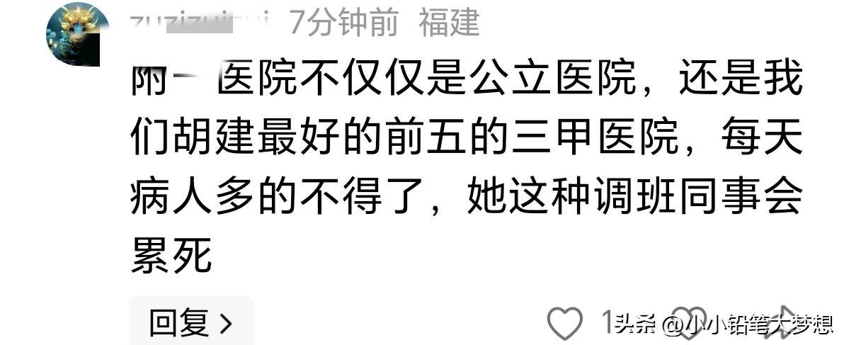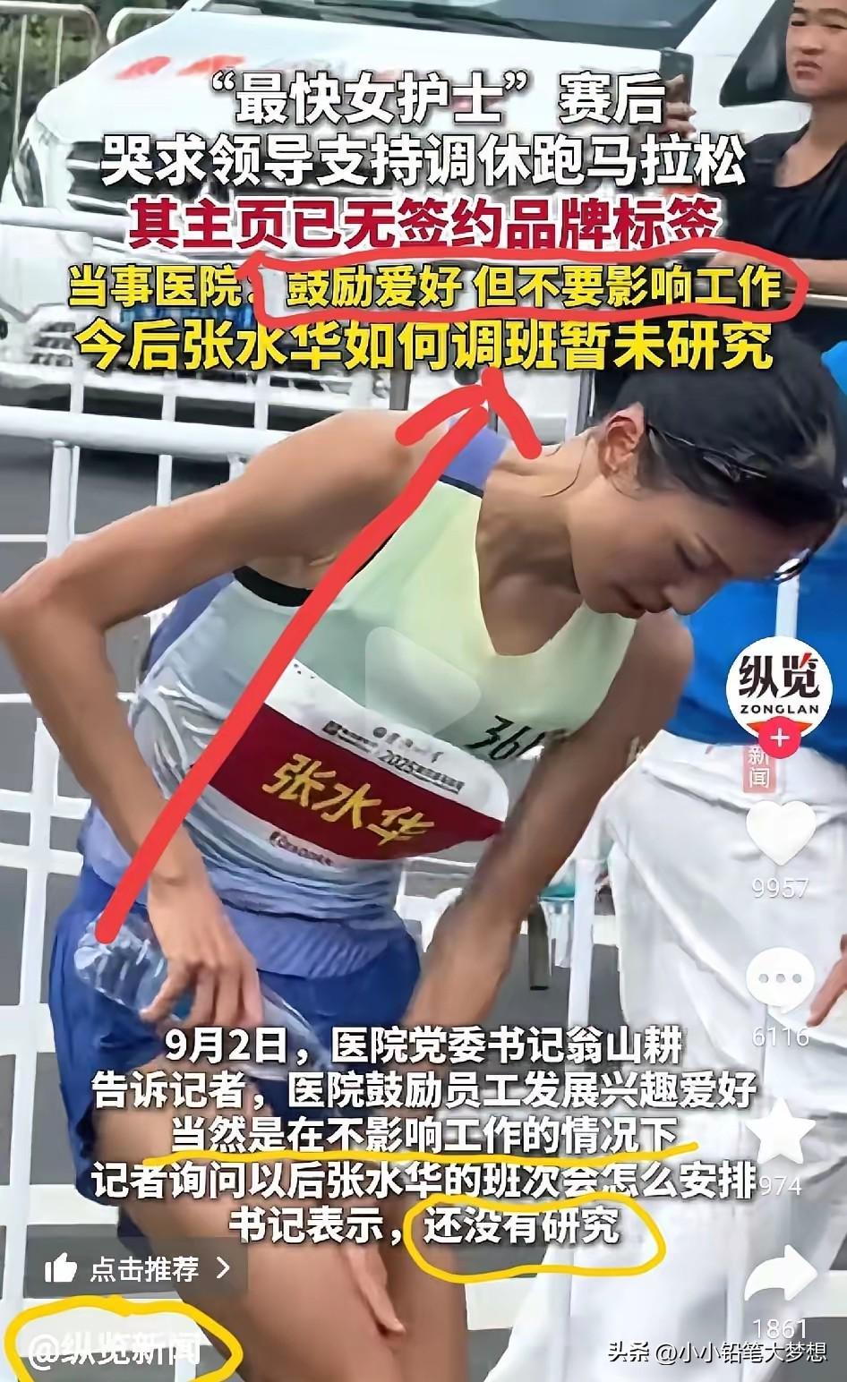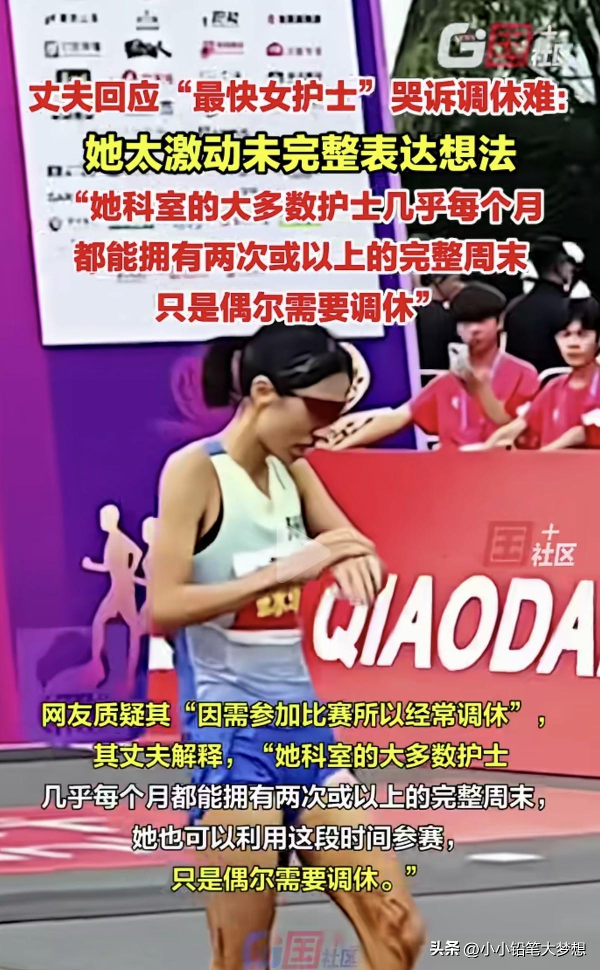 众所周知,护士工作很特殊经常要倒班,一个萝卜一个坑,没有闲散人员,几乎没有正常的周末,而且每个医生和护士的排班通常都要提前一个月安排,没有人愿意在周末加班,因为医院一般周末都比较忙,而且大家也想要在周末陪陪孩子,陪陪老人。如果让同事帮忙调休,那么就意味着有同事白班夜班可能要接着上。而且护士要求特别细心,但人的精力是有限的,本来跑马拉松就是非常高强度的运动,如果要想得到冠军那必须是全力以赴,那就意味着她把所有的精力都投放在马拉松上,那工作上是不可能100%兼顾的,有可能是会有漏洞。