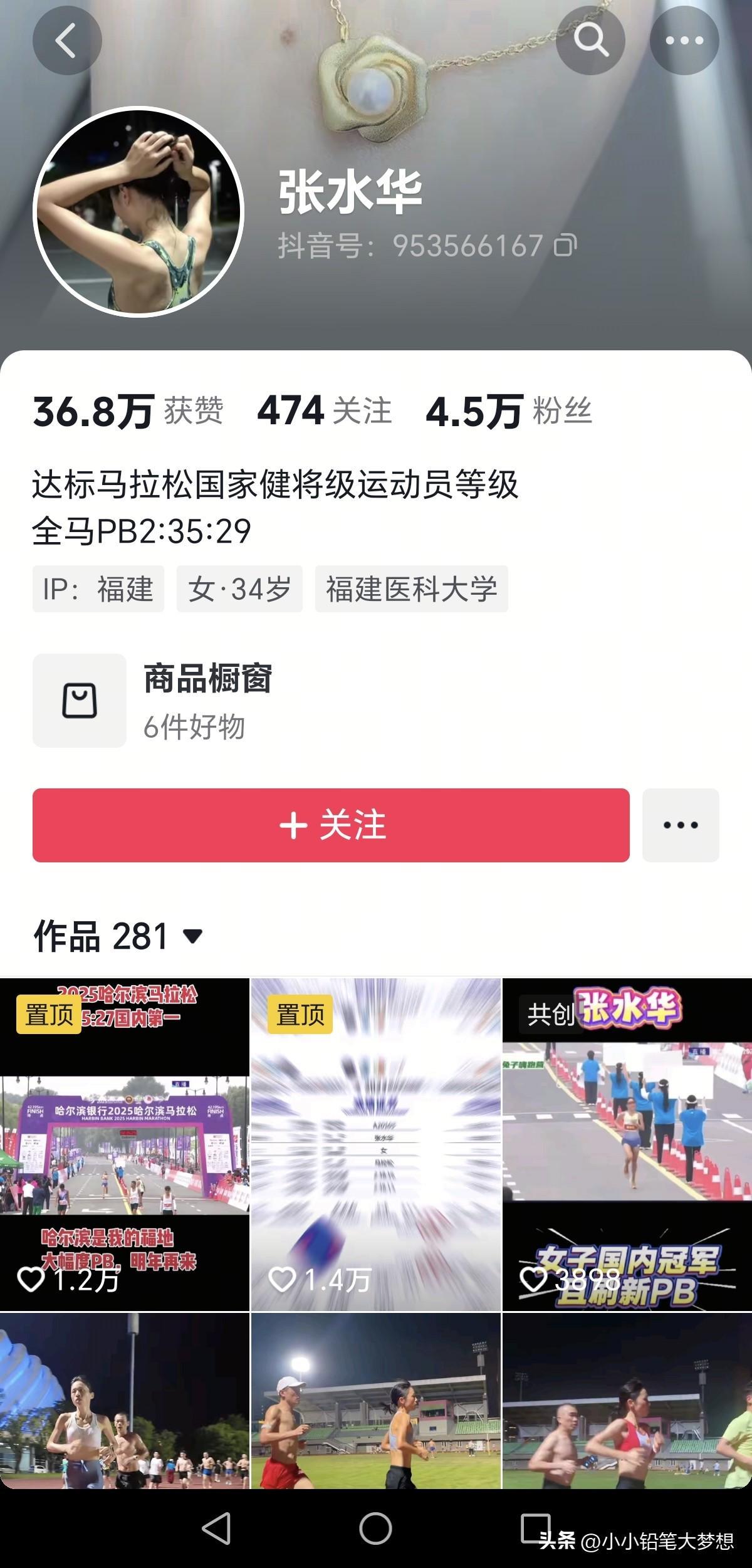而从她的抖音个人账号里面看全国各地的马拉松比赛她都有安排,且几乎每个周末都在参赛,全国各地到处跑,意味着她要花大量的时间奔赴现场,其中最耗时间的还是平时要花大量的时间拉练。