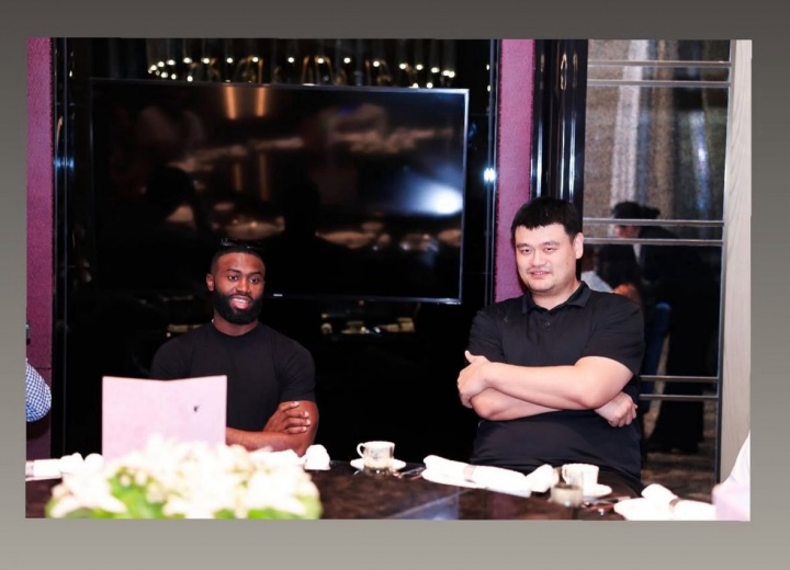 杰伦-布朗与姚明共聚欢迎晚宴,向其赠送亲笔签名球鞋。